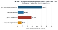 Total production costs for 16 DPA are divided across raw materials, energy, labor, and capital expenditure, with raw materials representing approximately 50 percent of total production cost, due to the high cost of steroid precursors.