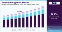 The global e-waste management market volume is estimated to reach 101.3 million metric tons in 2030 and is projected to grow at a CAGR of 6.7% from 2025 to 2030. The rapid pace of technological advancements significantly drives the growth of the market. As new technologies emerge and consumer electronics become more sophisticated, the lifecycle of electronic devices shortens, leading to increased turnover rates and higher volumes of discarded electronics. The scenario creates a substantial demand for effective and sustainable e-waste management solutions to handle the growing surge of electronic waste responsibly.The increasing adoption of electronic devices across various sectors fuels the market's growth. In recent years, there has been a remarkable increase in the adoption of smartphones, tablets, laptops, and other consumer electronics, driven by technological advancements and increasing consumer demand for connectivity and convenience. This trend extends beyond consumer electronics to encompass sectors such as Information Technology (IT), telecommunications, healthcare, and industrial equipment, where electronic devices are integral to operations and services. Technological innovations and the continuous evolution of electronic devices play a pivotal role in accelerating e-waste generation. As newer models with enhanced features and capabilities enter the market, older devices quickly become obsolete, prompting users and organizations to discard them.